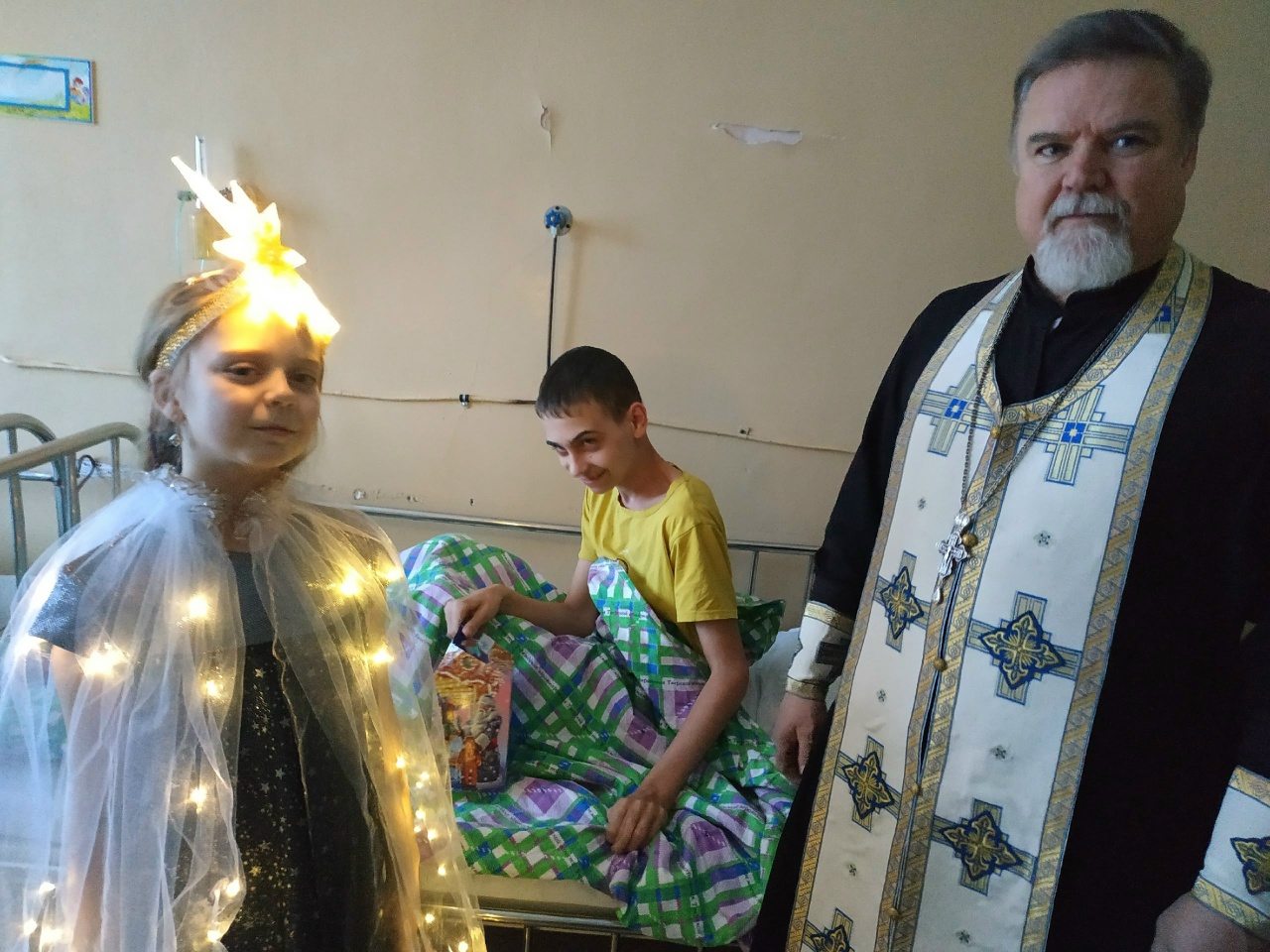 9 января прихожане и настоятель храма Преображения Господня, п. Солнечный поздравили с Рождеством Христовым медицинский персонал, взрослых и маленьких пациентов Вышневолоцкой ЦРБ и подарили сладкие подарки.