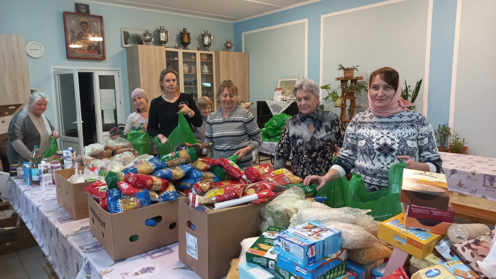 Приход храма апостола Андрея Первозванного п. Озёрный Бологовского благочиния собрал и передал малоимущим 45 продуктовых наборов.